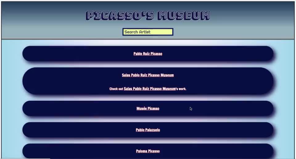 React app displaying the names of all Picasso family members and allows access to their museum exhibits. Includes React Router to display more information about each data. Uses the Picasso Museum API and styled with Flexbox.